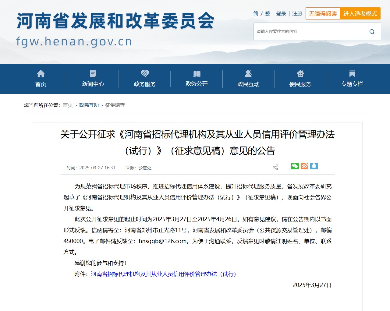 河南省發(fā)展和改革委員會(huì)對(duì)《河南省招標(biāo)代理機(jī)構(gòu)及其從業(yè)人員信用評(píng)價(jià)管理辦法(試行) 》公開(kāi)征求意見(jiàn)
