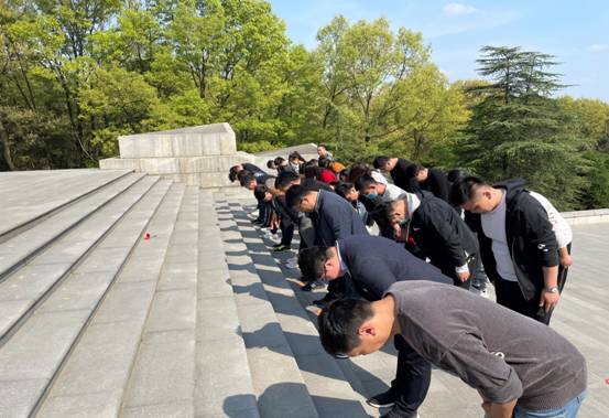 站在革命英雄紀念碑前,全體人員整齊列隊,莊嚴肅穆,向革命烈士鞠躬默哀。