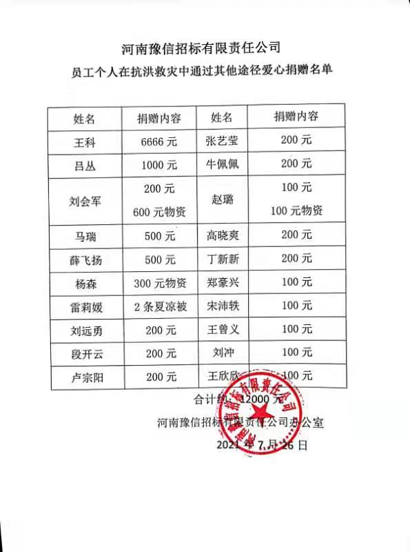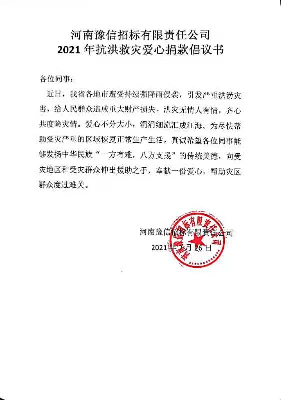 受超強降雨影響,目前河南省內抗洪救災仍在繼續(xù)!我省仍有多地汛情嚴峻,身為河南本土國有企業(yè),河南豫信招標有限責任公司 號召 公司干部職工 以實際行動幫助災區(qū)人民抗洪救災、重建家園 。