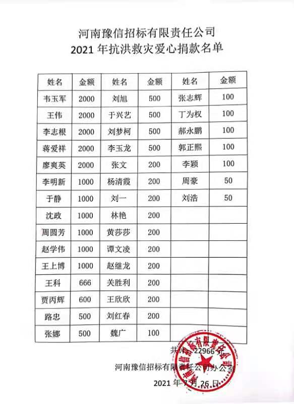 抗洪救災愛心捐款倡議書發(fā)出后 , 我公司員工積極響應,踴躍捐款,共計募集善款 22966 元,全部捐贈于河南省紅十字基金會;同時,公司員工通過其他途徑自發(fā)捐贈的善款與物資合計約 12000 元,也在第一時間送往災區(qū)。