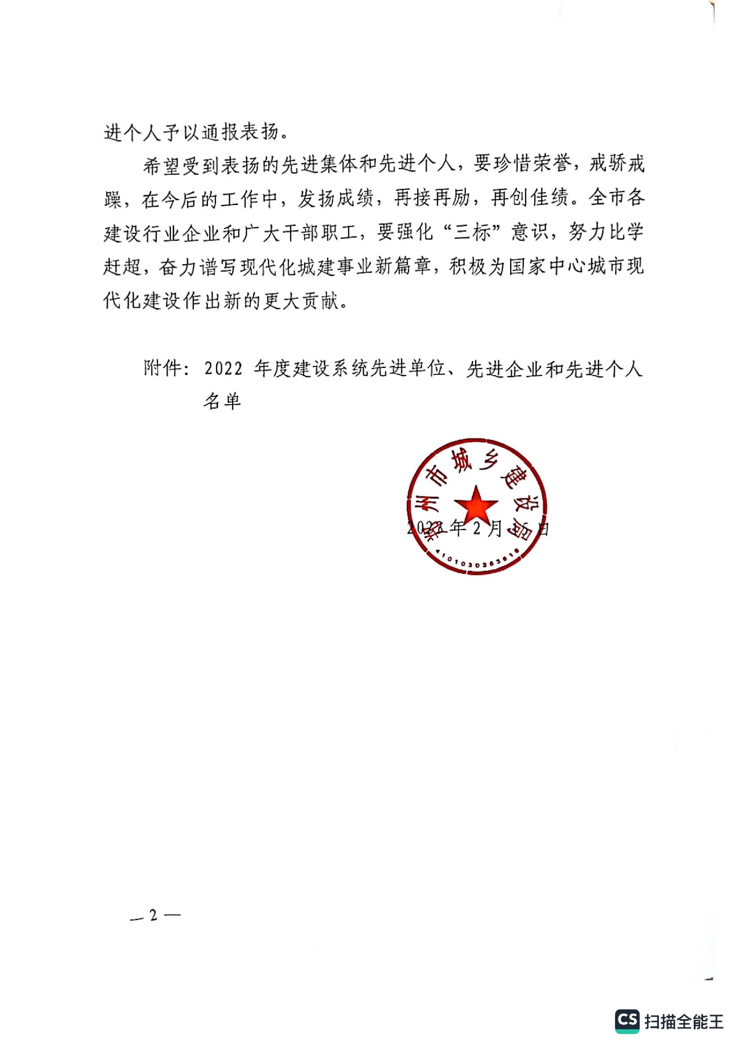 熱烈祝賀我公司獲得鄭州市城鄉(xiāng)建設(shè)局評(píng)定“2022年度建設(shè)系統(tǒng)先進(jìn)單位“企業(yè)稱(chēng)號(hào)。