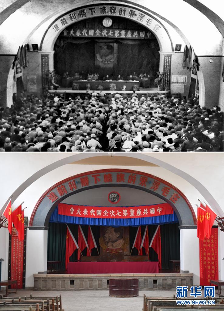 這是一張拼版照片,上圖為:中國(guó)共產(chǎn)黨“七大”會(huì)場(chǎng)(資料照片,新華社發(fā));下圖為:2021年3月31日拍攝的位于延安市楊家?guī)X革命舊址的中國(guó)共產(chǎn)黨“七大”會(huì)場(chǎng)(新華社記者張博文攝)。新華社發(fā)