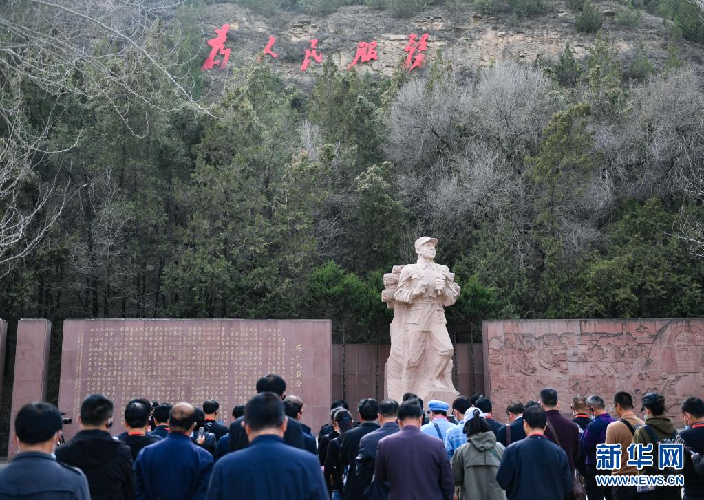 2021年3月29日,參觀者在延安市張思德廣場(chǎng)進(jìn)行現(xiàn)場(chǎng)教學(xué)活動(dòng)。新華社記者 張博文 攝
