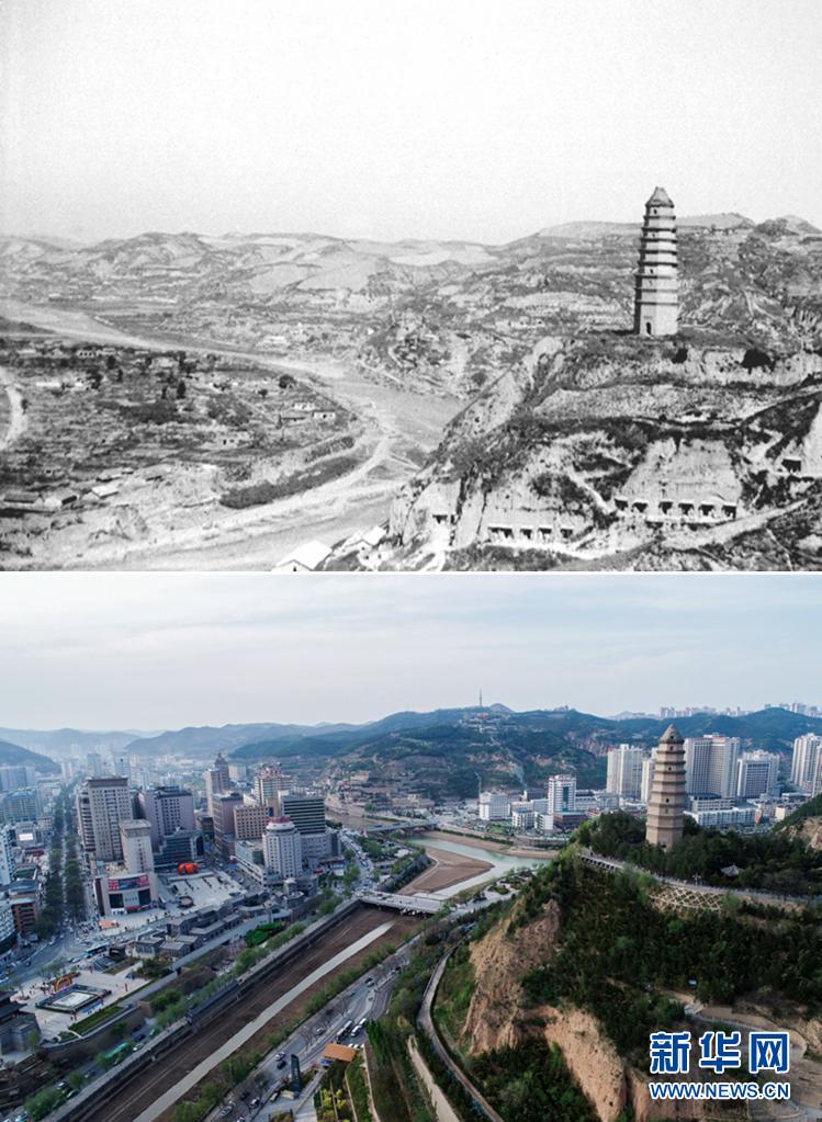 這是一張拼版照片,上圖為:1938年拍攝的延安(資料照片,新華社發(fā));下圖為:2021年4月22日拍攝的延安市(無(wú)人機(jī)照片,新華社記者張博文攝 )新華社發(fā)