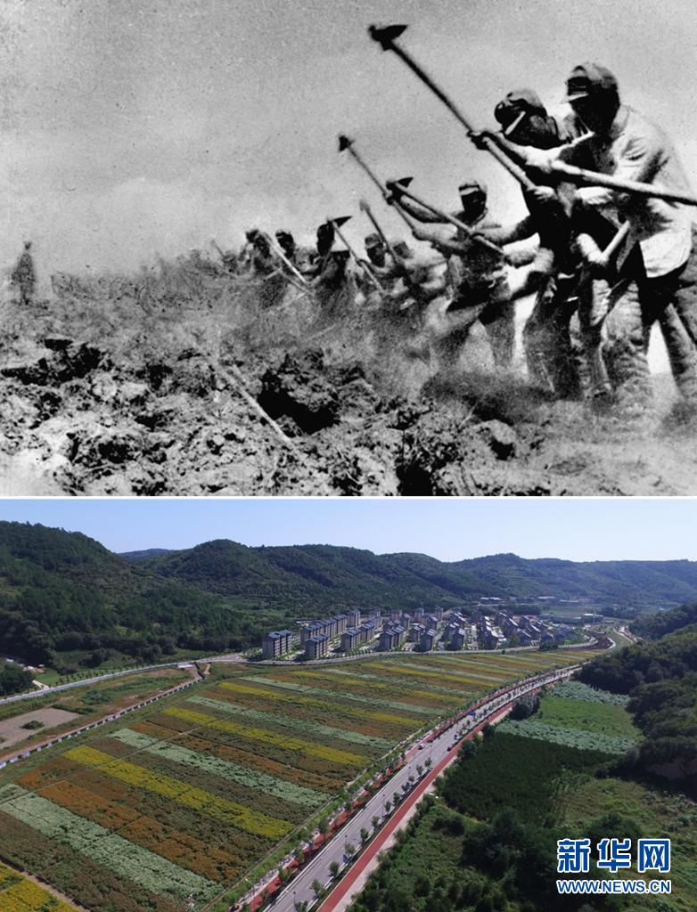這是一張拼版照片,上圖為:抗日戰(zhàn)爭(zhēng)期間,八路軍三五九旅在南泥灣開(kāi)荒生產(chǎn)(資料照片,新華社發(fā));下圖為:2020年8月25日拍攝的延安南泥灣景色(無(wú)人機(jī)照片,祁小軍攝)。新華社發(fā)