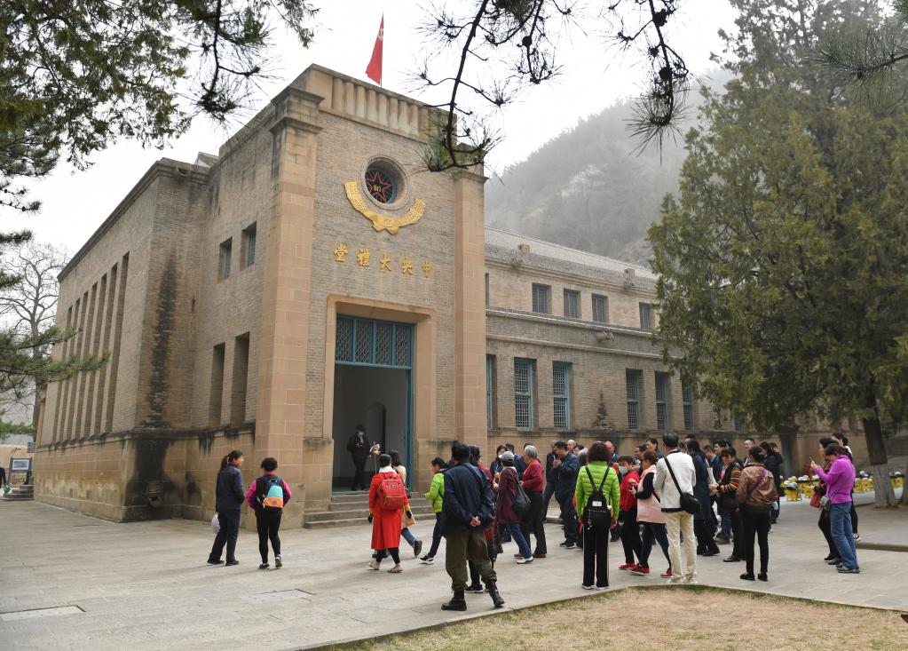 328日,參觀者在陜西延安楊家?guī)X革命舊址參觀。新華社記者張博文攝