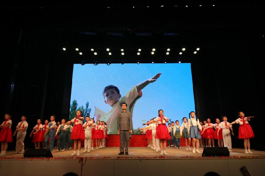 2021 年 5 月 29 日,新安小學(xué)師生在 “ 紅色基因代代傳 ” 全國青少年誦讀黨史故事(淮安區(qū)專場)活動中表演新旅故事情景劇《燃燒的信念》。紀(jì)星名 攝