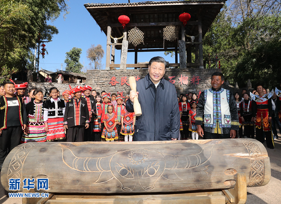 2020年1月19日至21日,中共中央總書記、國家主席、中央軍委主席習(xí)近平來到云南,看望慰問各族干部群眾,向全國人民致以新春祝福。這是19日下午,習(xí)近平在騰沖市清水鄉(xiāng)三家村中寨司莫拉佤族村廣場上,敲響三聲佤族木鼓,祝福來年風(fēng)調(diào)雨順、國泰民安。 新華社記者 鞠鵬 攝