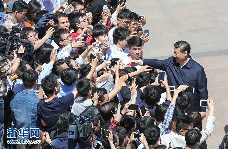 2018年5月2日,中共中央總書記、國(guó)家主席、中央軍委主席習(xí)近平來到北京大學(xué)考察。這是習(xí)近平離開學(xué)校時(shí)同道路兩旁師生親切握手。新華社記者王曄攝