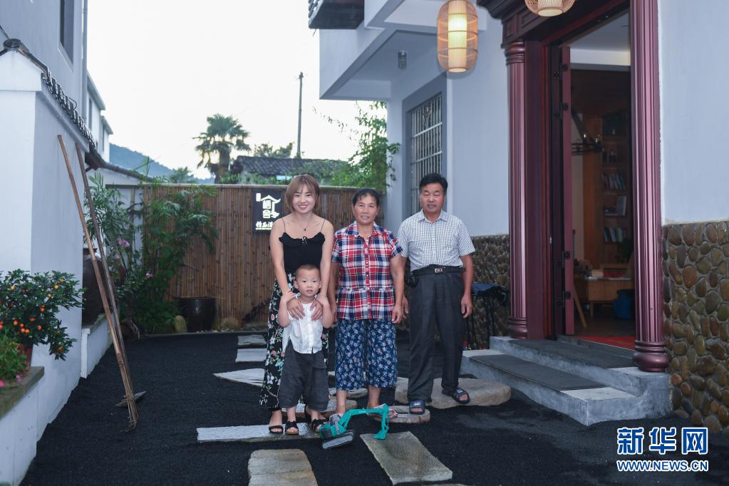201789日,在浙江省淳安縣楓樹嶺鎮(zhèn)下姜村,村民姜麗娟(左一)與父親姜北方(右一)、母親王洋球(中)及兒子安安在自家開辦的棲舍民宿院內(nèi)合影。新華社記者 黃宗治 攝