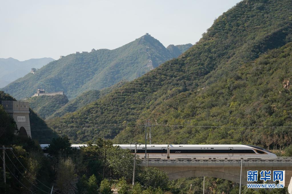 一列復興號高鐵列車從京張高鐵駛過居庸關長城(2020年10月6日攝)。新華社記者 鞠煥宗 攝