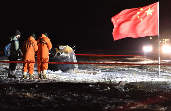 23天后的1217日凌晨,內蒙古四子王旗。在闖過月面著陸、自動采樣、月面起飛、月軌交會對接、再入返回等多個難關后,歷經重重考驗的嫦娥五號返回器攜帶月球樣品,成功返回地面。