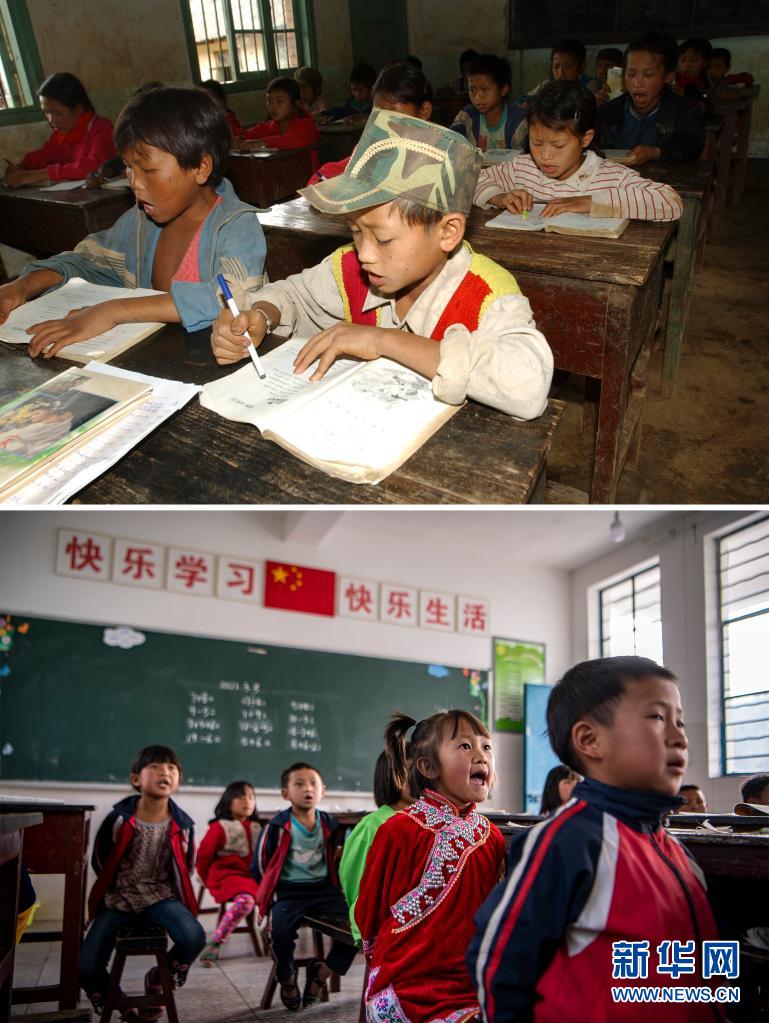 這是一張拼版照片。上圖:2003613日,云南省瀾滄拉祜族自治縣木戛鄉(xiāng)哈卜嗎村小學(xué)的學(xué)生張?jiān)祝ㄓ遥┰诮淌疑险n(新華社記者 秦晴攝);下圖:202133日,張?jiān)椎呐畠簭埬韧祝ㄓ叶┰诠穯岽逍W(xué)一年級(jí)的課堂上(新華社記者江文耀攝)。新華社發(fā)