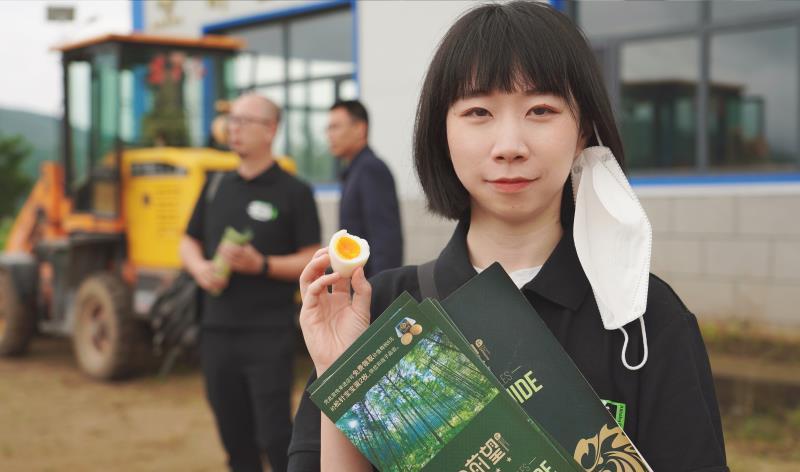 2020年8月,阿里鄉(xiāng)村品牌設(shè)計師蔣宇寧在吉林省汪清縣走訪調(diào)研松針雞養(yǎng)殖基地,手中拿著當?shù)氐乃舍橂u蛋。(受訪者供圖)