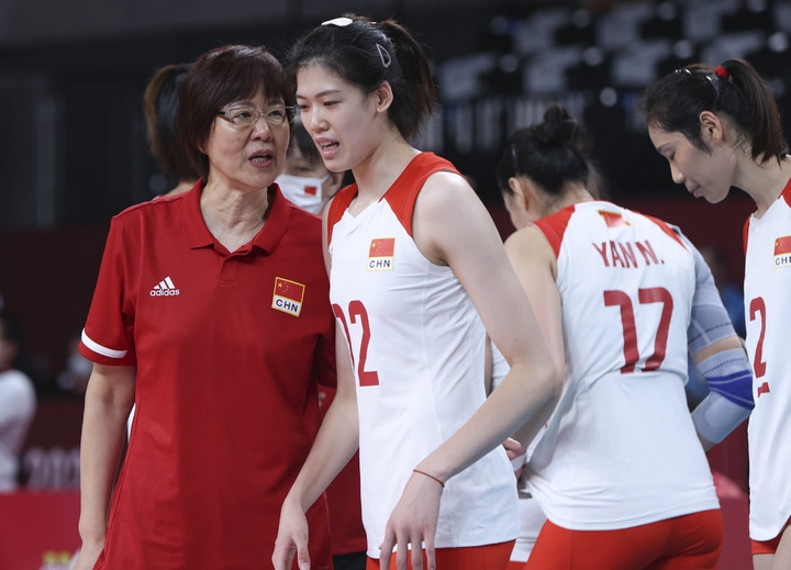 7月29日,中國(guó)隊(duì)主教練郎平(前左)在比賽間隙指導(dǎo)球員李盈瑩。當(dāng)日,在東京奧運(yùn)會(huì)女排小組賽中,中國(guó)隊(duì)以2比3不敵俄羅斯運(yùn)動(dòng)員。新華社記者 丁汀 攝