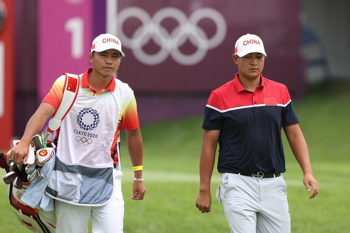7月29日,中國(guó)選手袁也淳(右)在比賽中。當(dāng)天,東京奧運(yùn)會(huì)高爾夫項(xiàng)目男子個(gè)人比桿賽在日本埼玉縣霞關(guān)鄉(xiāng)村俱樂部開賽。新華社記者 鄭煥松 攝