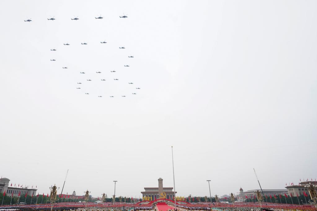 2021年7月1日上午,慶祝中國共產(chǎn)黨成立100周年大會(huì)在北京天安門廣場隆重舉行。這是大會(huì)開始前的飛行慶祝表演(2021年7月1日攝)。新華社記者 高潔 攝