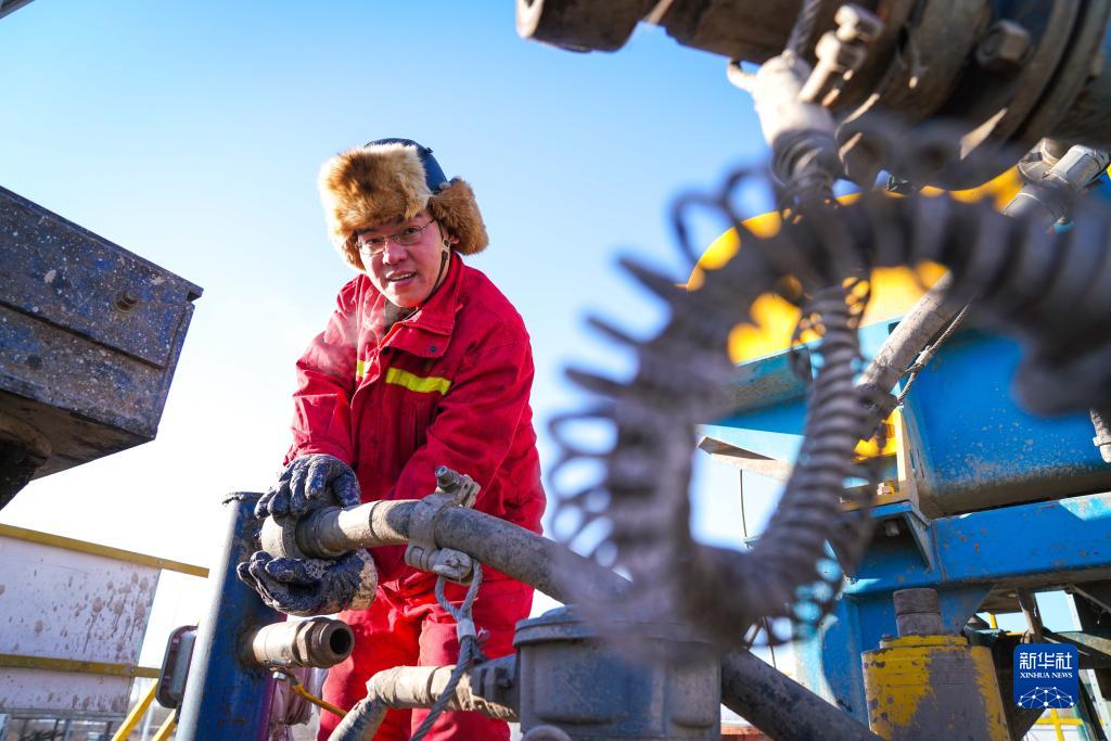 大慶油田1205鉆井隊鉆井工人在野外鉆井平臺作業(yè)(2021年1月7日攝)。新華社記者 王松 攝