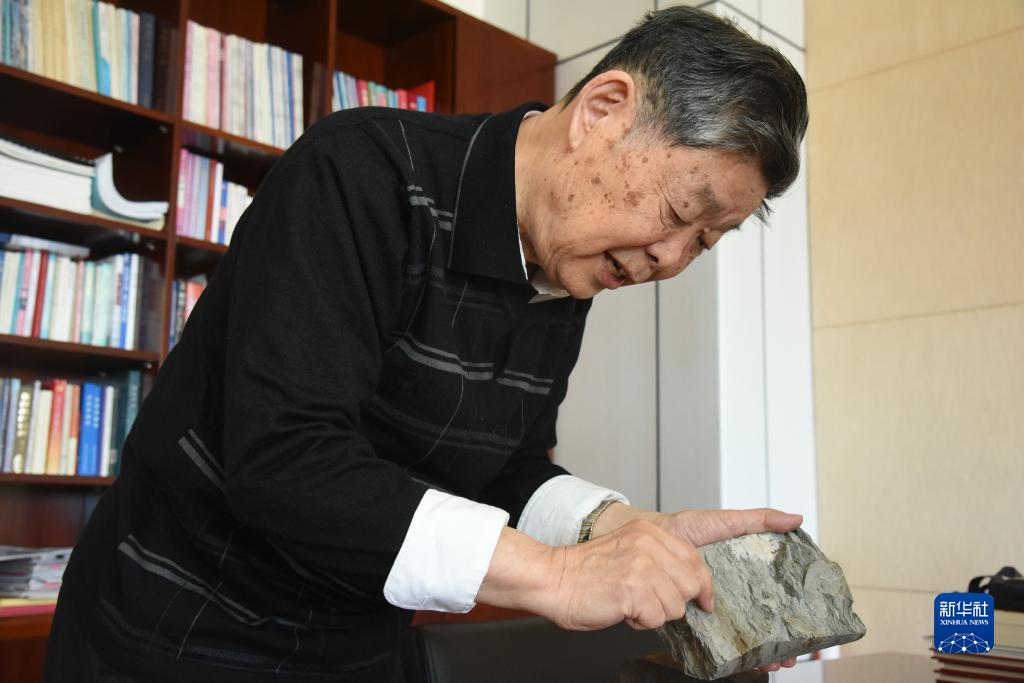 大慶油田第二代“鐵人”王啟民在辦公室手持巖心樣本介紹采油技術的發(fā)展情況(2021年2月25日攝)。新華社記者 楊喆 攝
