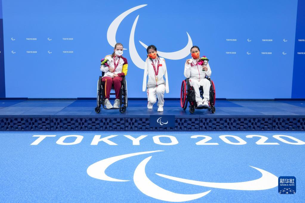 8月27日,在東京殘奧會游泳女子50米蝶泳S5級頒獎儀式上,中國選手盧冬(中)單腿下蹲,與隊友成姣(右)、西班牙選手瑪爾塔·因方特處于同一高度合影。新華社記者 張鋮 攝