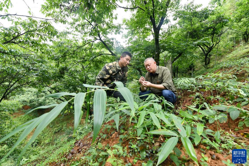 福建建甌市林權改革發(fā)展服務中心的科技特派員陳國興(右)在建甌市玉山鎮(zhèn)上房村一處林下種植園給村民講授中藥材栽培方法(5月28日攝)。新華社記者 林善傳 攝