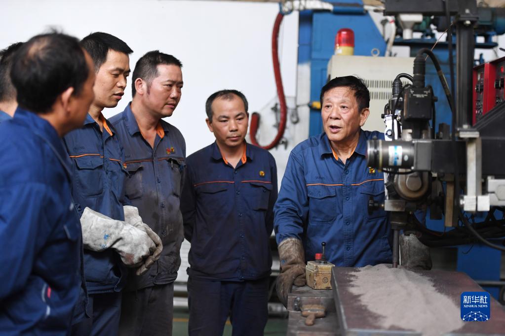 6月17日,艾愛(ài)國(guó)(左一)在湖南湘潭湘鋼高級(jí)技工學(xué)校焊接實(shí)習(xí)基地檢查學(xué)生的焊接作業(yè)。新華社記者 薛宇舸 攝