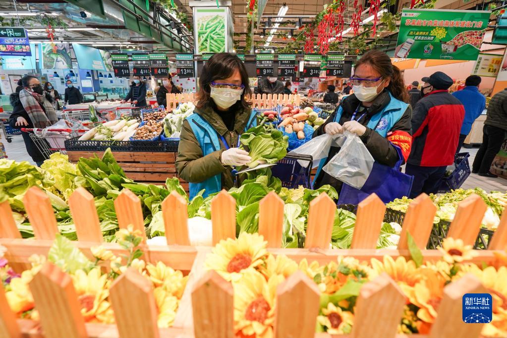 南京市建鄴區(qū)南苑街道興達(dá)社區(qū)的網(wǎng)格長(zhǎng)范璐(左)和同事在超市為轄區(qū)內(nèi)居民代購蔬菜(2020年2月17日攝)。新華社記者 李博 攝