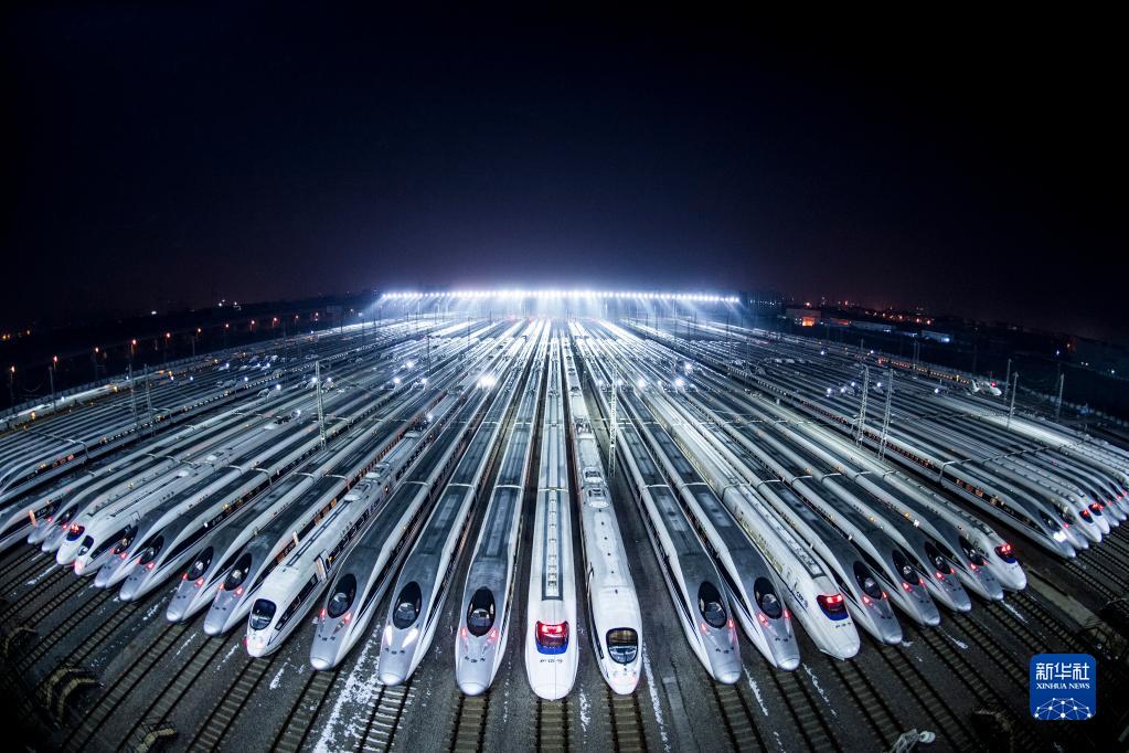 動車組??吭谖錆h動車段的存車線上,準(zhǔn)備進行檢修和保溫作業(yè)(2018年2月1日攝)。新華社記者 肖藝九 攝