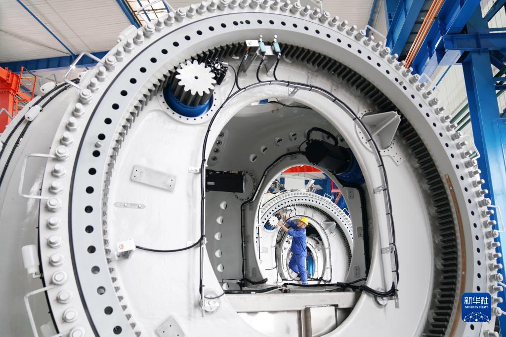 在位于黑龍江省齊齊哈爾市的中國一重集團有限公司風(fēng)電裝備生產(chǎn)制造廠生產(chǎn)車間,工人在進行生產(chǎn)作業(yè)(7月1日攝)。新華社記者 王建威 攝