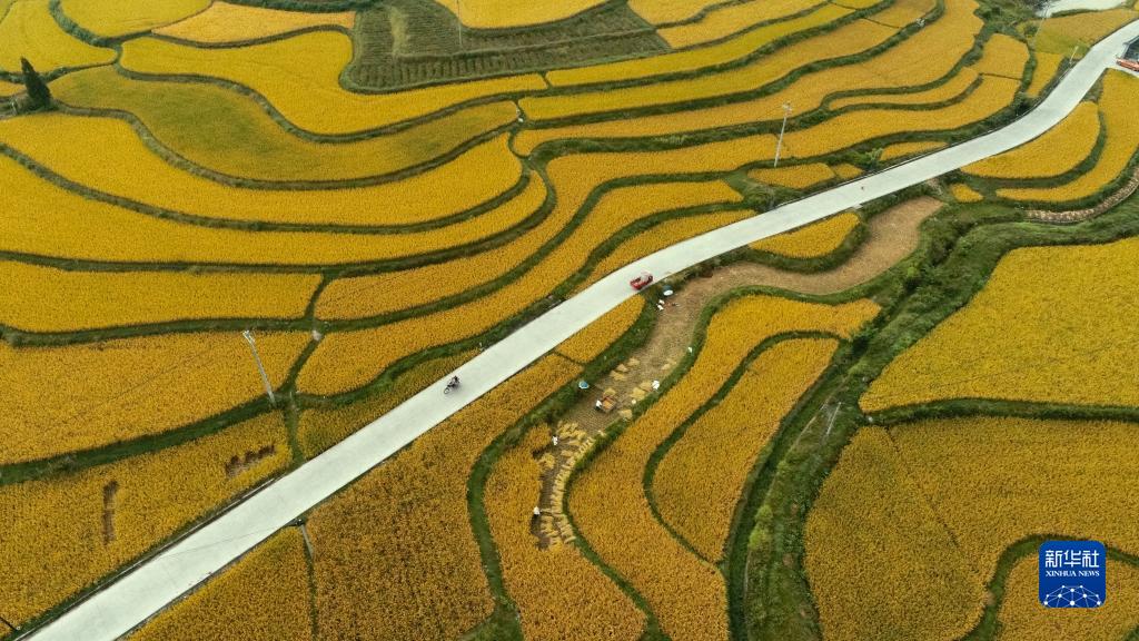 9月12日,農(nóng)民在貴州省龍里縣灣灘河鎮(zhèn)金批村稻田里收獲稻谷(無人機照片)。新華社發(fā)(龍毅 攝)