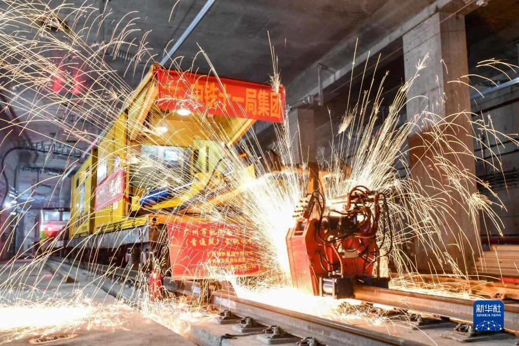 中鐵十一局軌道焊機(jī)在焊接廣州地鐵18號線首通段最后一個鋼軌接頭(4月20日攝)。新華社記者 劉大偉 攝
