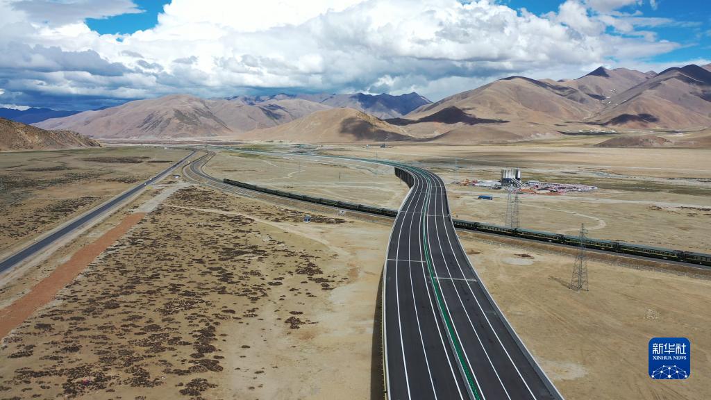 在京藏高速那曲至羊八井段,火車經(jīng)過跨青藏鐵路特大橋(5月30日攝,無人機照片)。新華社發(fā)(胡雪峰 攝)