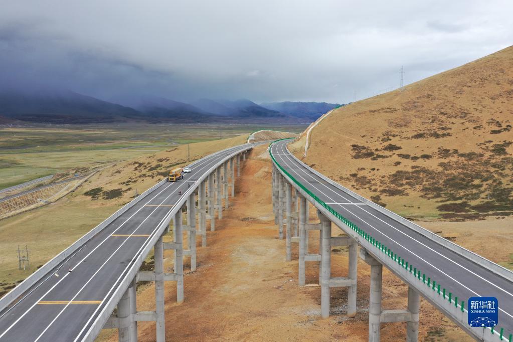 西藏拉薩市當(dāng)雄縣境內(nèi)由中鐵城投承建的京藏高速那曲至羊八井段堆巴果大橋(5月29日攝,無人機照片)。新華社發(fā)(胡雪峰 攝)