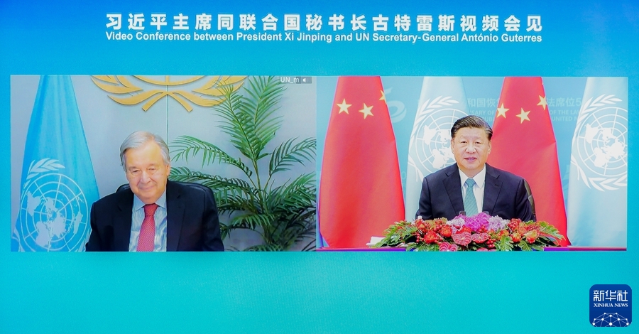 10月25日上午,國家主席習近平在北京人民大會堂以視頻方式會見聯(lián)合國秘書長古特雷斯。新華社記者 翟健嵐 攝