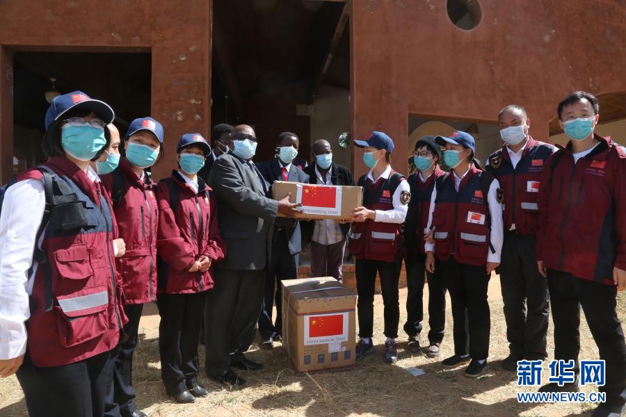 5 月 19 日,在津巴布韋中馬紹納蘭省的姆武爾維醫(yī)院,中國抗疫醫(yī)療專家組為當?shù)蒯t(yī)療機構捐贈醫(yī)療物資。新華社記者 張玉亮 攝