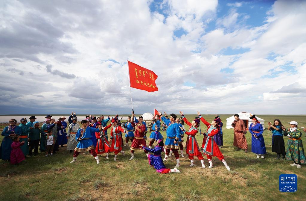 2018年8月22日,內(nèi)蒙古蘇尼特右旗烏蘭牧騎隊(duì)員在牧區(qū)演出。新華社發(fā)(東哈達(dá)攝)