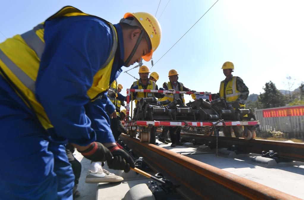 2021年12月1日,施工人員在常益長高鐵黃橋大道特大橋鋪軌現(xiàn)場施工。新華社記者 趙眾志 攝