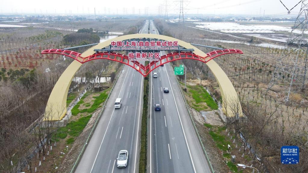 這是2022年2月10日拍攝的S2滬蘆高速上的中國(上海)自由貿(mào)易試驗區(qū)臨港新片區(qū)“海鷗門”(無人機照片)。新華社記者 方喆 攝