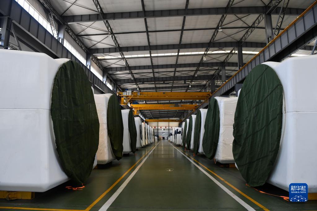 這是在內(nèi)蒙古鄂爾多斯市一家能源裝備有限公司生產(chǎn)車間拍攝的準備出售的風電機(2018年4月18日攝)。新華社記者 劉磊 攝