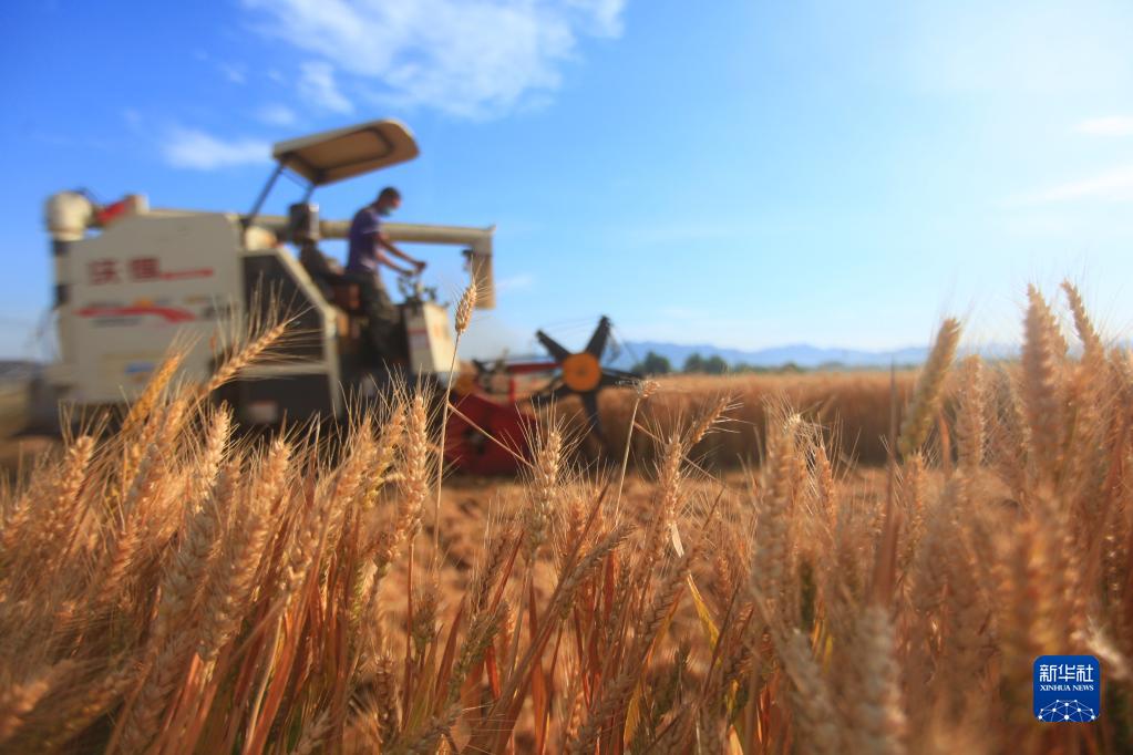 山東省臨沂市平邑縣農民駕駛收割機在田間收獲小麥(2021年6月8日攝)。 新華社發(fā)(武紀全攝)