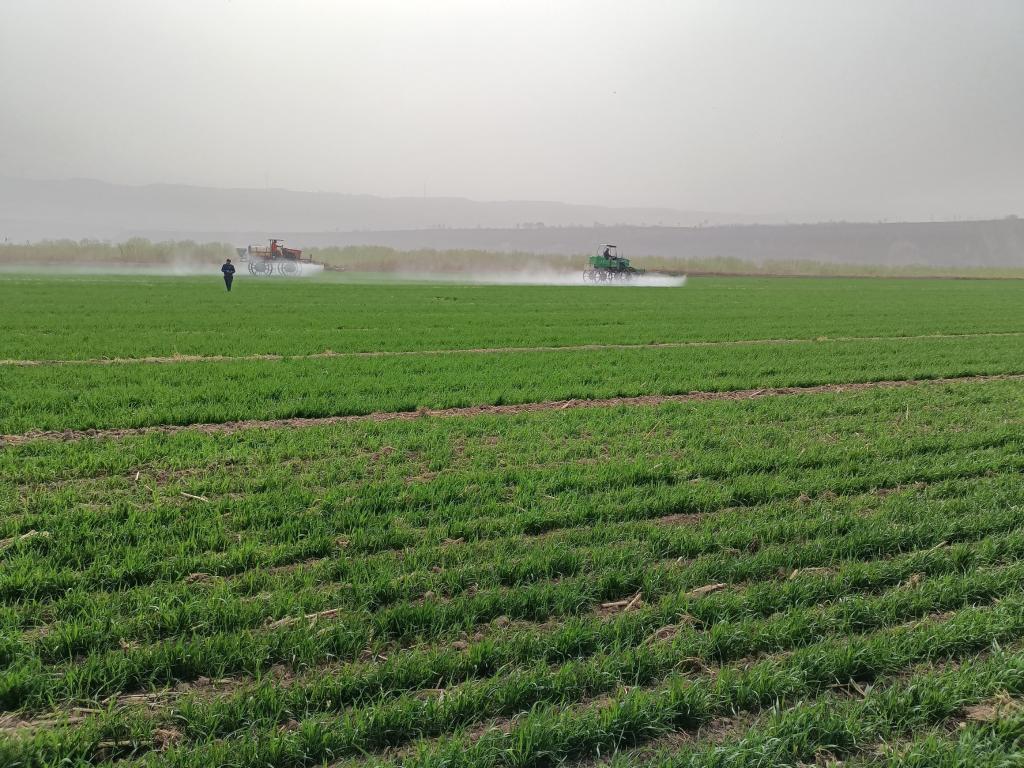 在胡天妮的麥田里,機器噴灑葉面肥和殺菌劑以促弱苗轉(zhuǎn)壯。受訪者供圖。