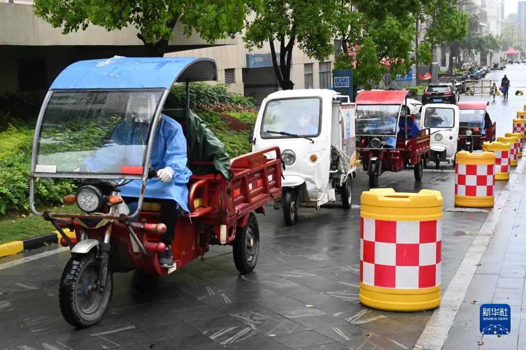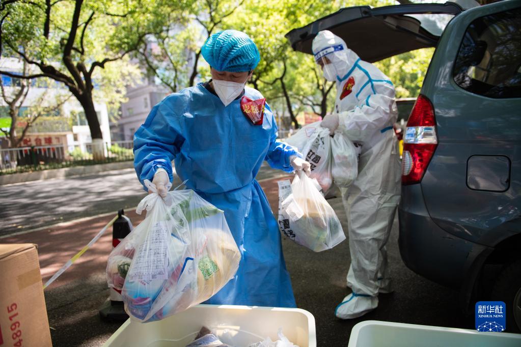4月7日,在長(zhǎng)沙市雨花區(qū)東塘街道楓樹(shù)山社區(qū),志愿者在卸載生活物資。新華社記者 陳思汗 攝