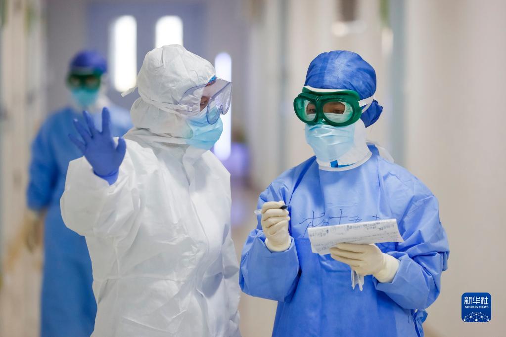 在武漢市金銀潭醫(yī)院的一個病區(qū),金銀潭醫(yī)院護(hù)士與浙江省人民醫(yī)院護(hù)士(右)交接工作(2020年3月18日攝)。新華社記者 沈伯韓 攝
