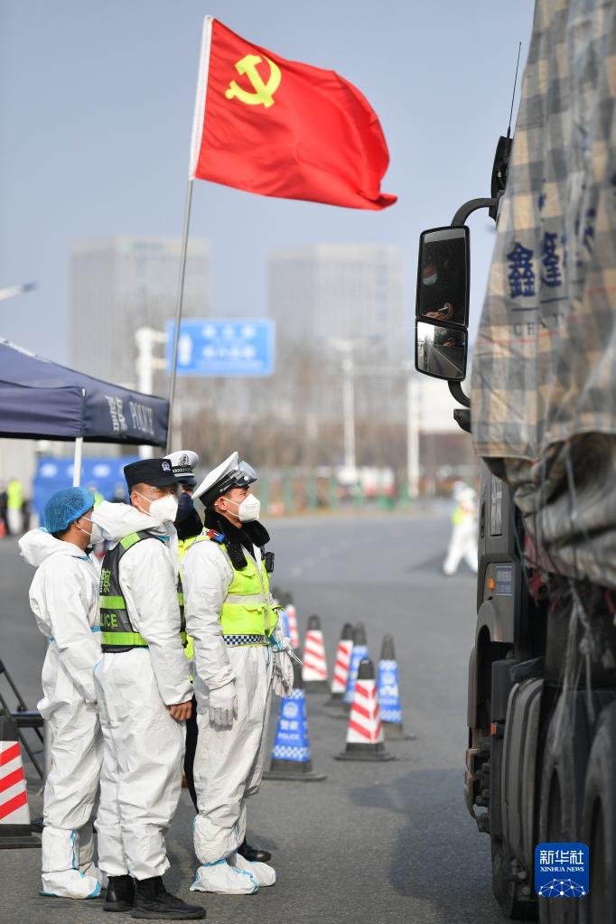石家莊市公安局高新技術(shù)產(chǎn)業(yè)開發(fā)區(qū)公安分局民警在藁城區(qū)通往市區(qū)的路口執(zhí)勤(2021年1月10日攝)。當日是首個“中國人民警察節(jié)”。新華社記者 楊世堯 攝
