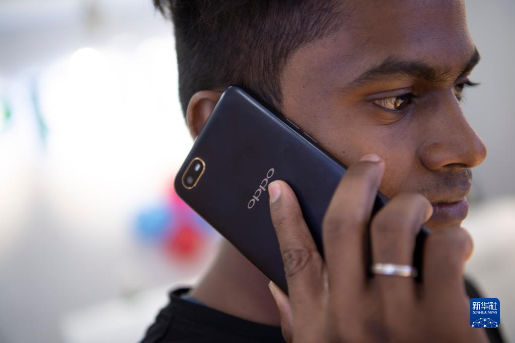 2019年10月8日,一名男子在印度金奈的一家商場使用中國品牌的手機(jī)。新華社記者 呂小煒 攝