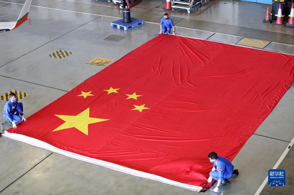 直升機(jī)務(wù)教官蔡澤民套上鞋套,戴上白手套,拿著夾有《國旗及國徽條例》的文件夾,一一對(duì)照檢查。國旗是在具備資質(zhì)的廠家專門定制的,規(guī)格規(guī)范都有嚴(yán)格要求。國旗大,就有拼接。蔡澤民主要查看色澤是否飽滿和均勻,接縫是否平整,四條邊上有沒有線頭等,特別要注意的是,五顆星星處不可有接縫。一番操作下來,后背已然濕透。