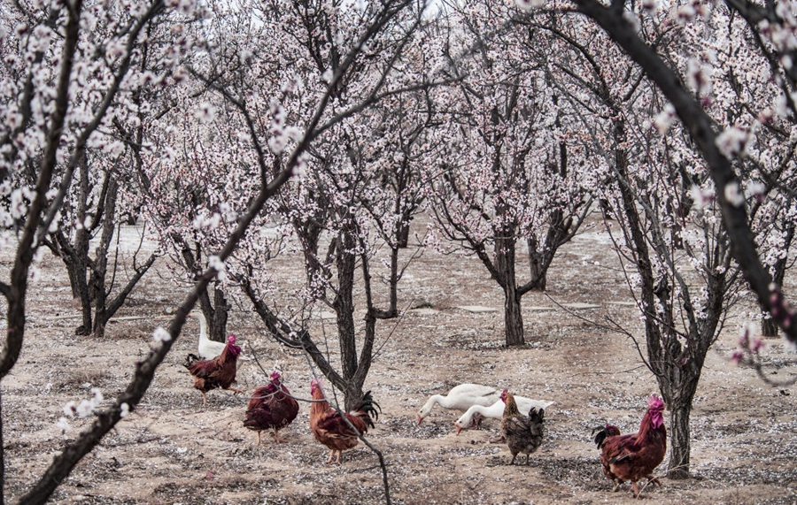↑一群雞鵝在陜西省榆林市榆陽區(qū)古塔鎮(zhèn)趙家茆村的杏樹林里覓食(2020年4月7日攝)。當?shù)厝罕娫诎l(fā)展杏產(chǎn)業(yè)的同時發(fā)展林下經(jīng)濟,成效顯著。