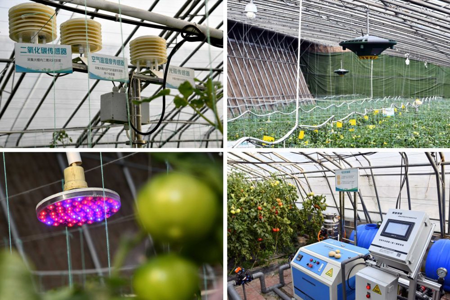 ↑這是在山東省壽光市現(xiàn)代農(nóng)業(yè)高新技術(shù)試驗示范基地拍攝的AI智慧大棚內(nèi)景。左上為傳感器設(shè)備;右上為多功能植保機;左下為補光燈;右下為電動噴淋機(2020年4月21日攝)。