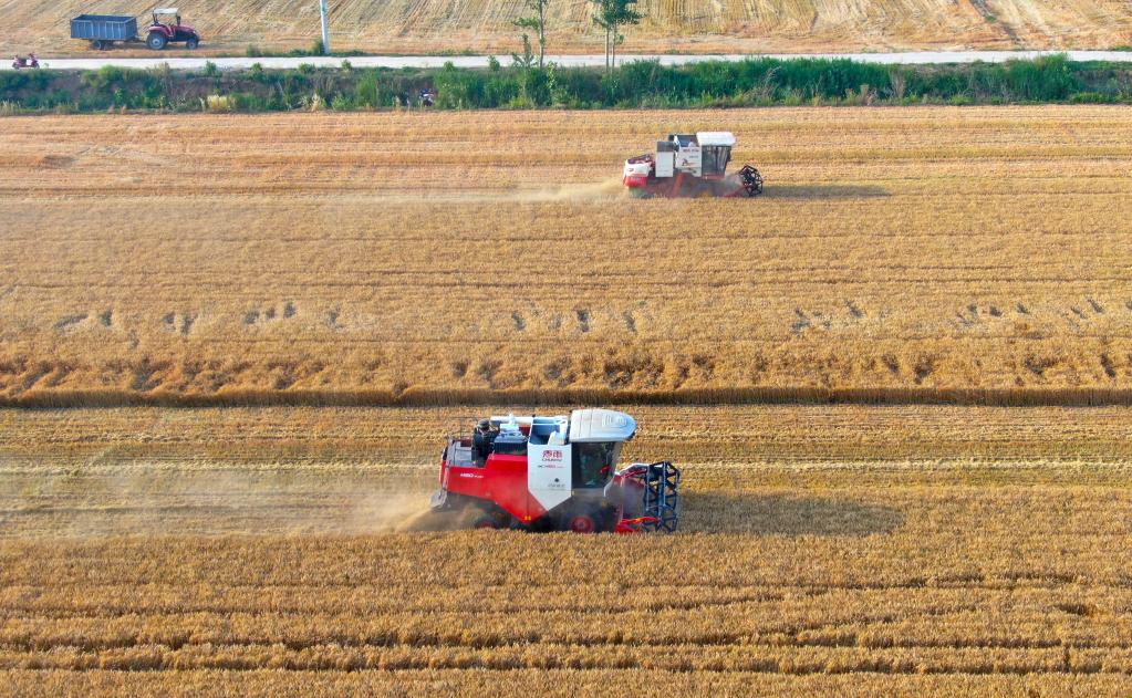 2022年6月8日,在河南省安陽市湯陰縣菜園鎮(zhèn)高標準農(nóng)田示范區(qū),收割機在麥田作業(yè)(無人機照片)。新華社記者郝源攝