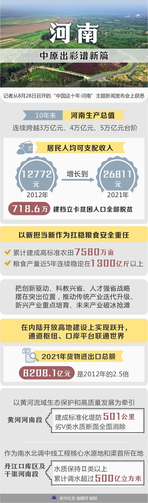10年來(lái),河南生產(chǎn)總值連續(xù)跨越3萬(wàn)億元、4萬(wàn)億元、5萬(wàn)億元臺(tái)階,居民人均可支配收入從2012年的12772元增長(zhǎng)到2021年的26811元,718.6萬(wàn)建檔立卡貧困人口全部脫貧。